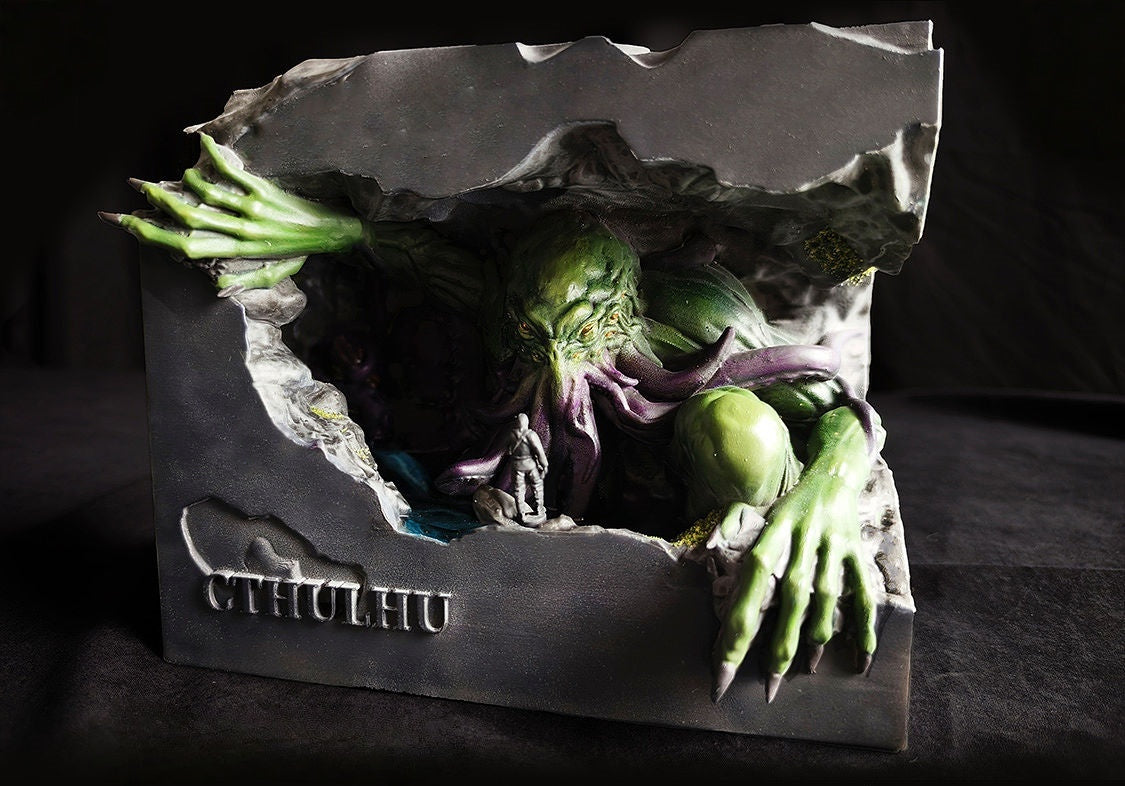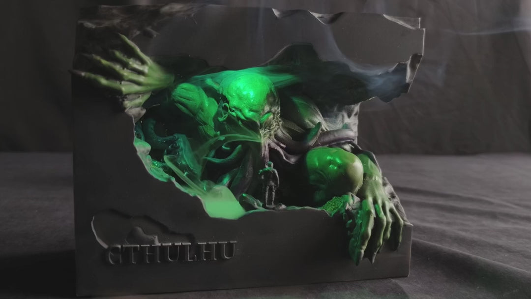The overall design centers on a Cthulhu theme, featuring a stone-like structure and cave-inspired environment. It is suitable for placement on desks, shelves, or display spaces as a decorative piece. When backflow incense or aroma incense is lit, the smoke flows downward along the structure and disperses within the interior space, creating a clear and engaging visual effect.